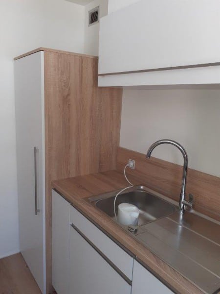 Nos équipes ont tout d’abord procédé à la pose d’un revêtement de sol stratifié imitation bois sur tout la surface avec sous-couche. Le revêtement de sol stratifié à l’avantage d’être facile d’entretien et de pose, bénéficie d’une bonne isolation thermique et a un très bon rapport qualité / prix.